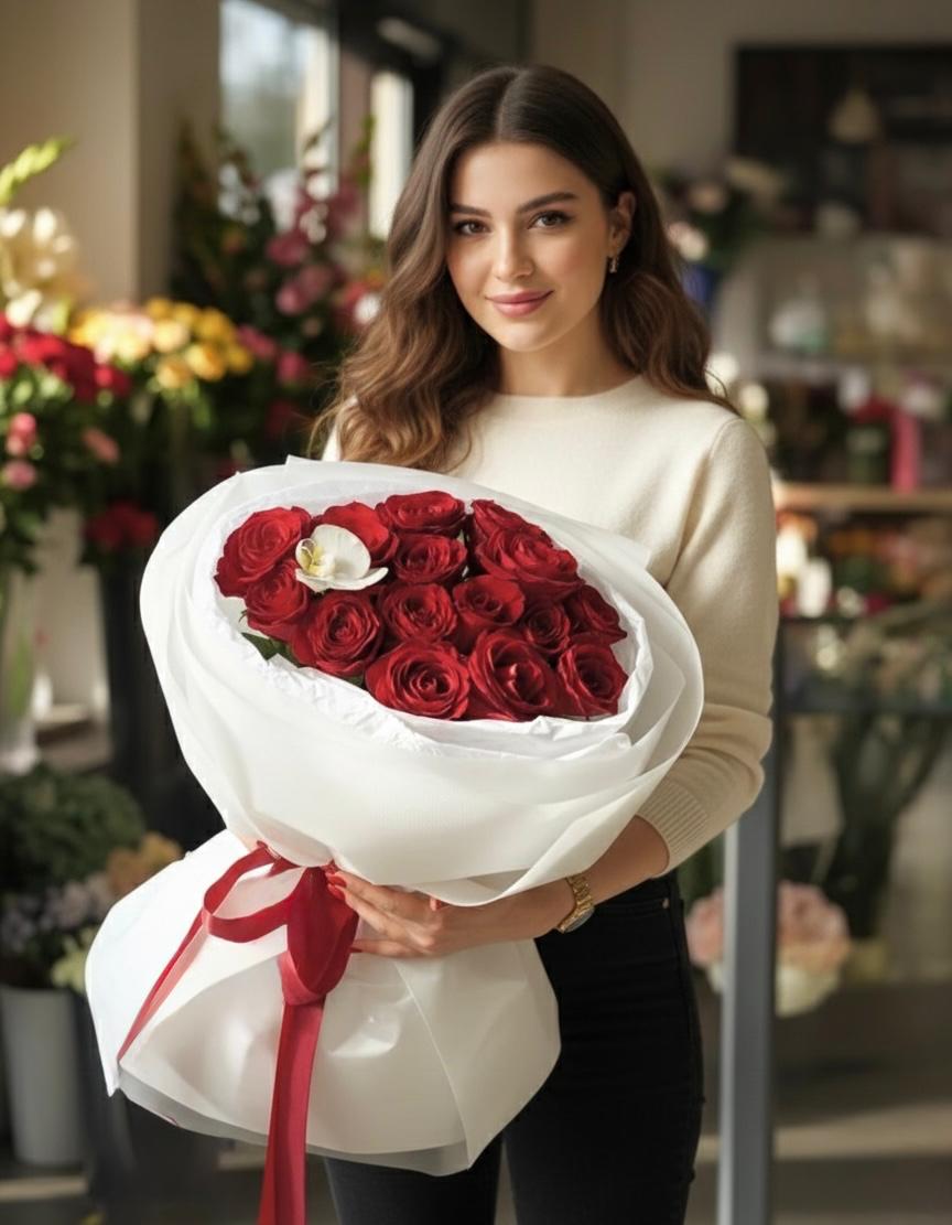 Rich red blooms styled with elegance, creating a powerful symbol of love and devotion.