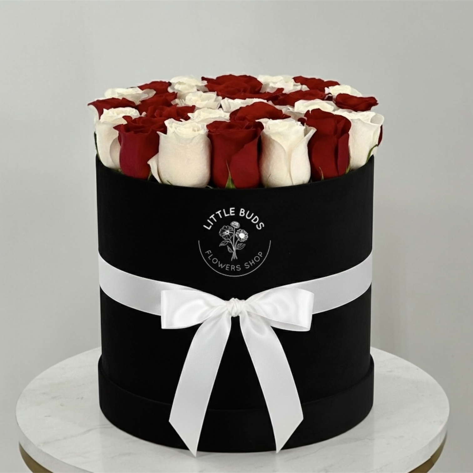 s.A striking black box arrangement featuring 40-45 premium red and white roses, artfully arranged to create a bold contrast of passion and purity. Finished in a sleek black cover, this luxurious floral box makes a powerful statement of love, elegance, and modern romance—perfect for anniversaries, proposals, or unforgettable surprise
